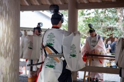 この日に参拝したのは偶然だったのですが、ちょうど「東遊(あずまあそび)」が催されていました。伊勢神宮では神様のお祭り、簡単に言うと「神様の新年会」が行われるのですが、そこで奉納されるのが日本古来の歌舞「東遊」なのです。
